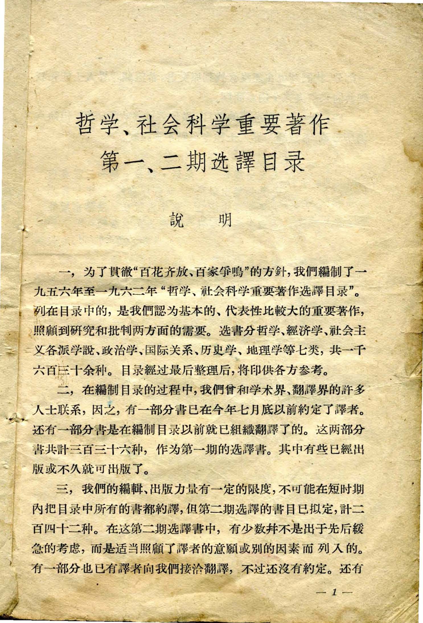 1954年,在中宣部有關領導的關照下,人民出版社成立了三聯書店編輯部,人民出版社副總編輯陳原兼任編輯部主任。根據上級指示,三聯書店編輯部的一個重要任務便是負責外國哲學、社會學科重要著作的規劃與翻譯工作,并參照科技界、社科界的“十二年遠景規劃”,編制了一份包含一千三百零三種書目的《1956年-1967年哲學、社會科學重要著作選譯目錄(草稿)》(俗稱“藍皮書”,這份書目以古典學術著作為主,兼顧少數有定評的現代著作,也包括了一部分學術史、思想史和國際關系、時政類著作),它是“漢譯世界學術名著叢書”的初始規劃?!八{皮書”由人民出版社和三聯書店、世界知識社(三聯書店和世界知識社此前已并入人民出版社)在1956年8月編??;在分發全國相關機構和人員征求意見后,依據反饋又在1957年春修訂了這份規劃,將選目類別由六類變為七類,書目擴展到一千六百三十二種,同時規劃年份由1956-1967年變成了1956-1962年(筆者在前面提到的文章中關于“藍皮書”1957年春“修訂稿”的部分說法很可能是錯誤的,特此更正)。