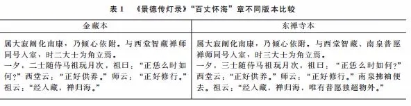 由以上數例可以看出,“非實質性異文”是在刊刻流傳過程中由于字形、字音等因素形成的異文,對于此類異文,可以利用文字、音韻、避諱等小學知識,判裁其正誤,并最終確定一個正確的異文。而對于下面這些“實質性異文”,則很難用小學的方法抉擇出一個“正確”的文本,如卷6“百丈懷?!闭拢ㄒ姳?)。