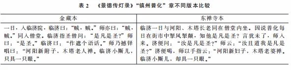 《景德傳燈錄》是北宋真宗朝吳僧道原所作的禪宗燈史,其書集錄自過去7佛,及歷代禪宗諸祖共1701人的傳燈法系。此書的版本約可分為四個系統:以金藏廣勝寺本為代表的中原藏經系統,以東禪寺本為代表的南方藏經系統,元延祐三年(1316)希渭刻本系統,《萬僧問答景德傳燈全錄》系統。通過不同版本間的對校,可以發現大量異文,這其中既有“非實質性異文”,也有“實質性異文”。