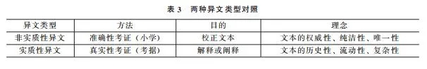 通過《景德傳燈錄》的具體例證可以看出:在文本的對校中會出現兩種異文,“實質性異文”和“非實質性異文”。此兩類異文普遍存在于??睂嵺`中,但對兩類異文的處理與關注,中西方存在著比較大的差異。我國由于進入印刷時代較早,保存的抄本、寫本相對較少,所以異文中“非實質性異文”所占比重較大,而在處理“非實質性異文”方面積累了豐富的經驗與技術,借助于文字學、音韻學、訓詁學等小學的知識,大量的“非實質性異文”可以得到解決。然而,由于印本時代典籍的整齊化過程,大量的“實質性異文”已被消除,多數典籍文本趨于整齊,可以說很長的時間內,“實質性異文”并沒有受到傳統??睂W的足夠關注。20世紀以來,簡牘、帛書、敦煌文書、黑水城文獻、日本古抄本等文獻的陸續發現,使我們得以重見抄本時代的典籍文獻,也使我們知道,典籍整齊化之前存在著大量的“實質性異文”。而這些“實質性異文”既不能從典籍內部通過小學的方法得以解決,也無法全部抉擇出最佳文本,定于一尊。只有將文化環境、意識形態、權力機制考慮進去,才能解釋這些異文產生的機制,對這些異文進行合理的闡釋。也就是說,對于“非實質性異文”可以運用文字、音韻、訓詁等小學的方法,通過“準確性”考證,最終校正錯謬,整理出一個“正確”的文本。而對于“實質性異文”,則需要綜合運用考據學的方法,進行“真實性”考證,對異文產生的文化環境、意識形態及權力機制進行分析,弄清異文產生的機制。對于此類異文,或許最終無法決定異文的正誤,進言之,這些異文本身其實并無“正誤”之分,而只是不同知識譜系中的形成物。對于“非實質性異文”,可以通過校正錯誤得到正解;而對于“實質性異文”,只能通過對比作出解釋?!胺菍嵸|性異文”的處理實際上是對文本權威性、純潔性、唯一性的追求;“實質性異文”的處理則是對文本歷史性、流動性、復雜性作出的分析與描述(見表3)。而要發現、解決文本歷史性、復雜性的問題,則需借助于文本的考古。