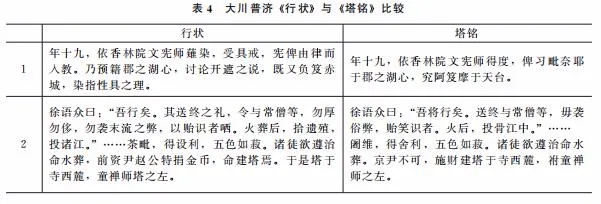 首先來看,從行狀到塔銘普濟的生平信息發生了哪些變化?通過對比發現,除了文本形式(如行狀只敘不銘,而塔銘則有敘有銘)、語言表達不同之外,有些史實也發生了變化(見表4)。