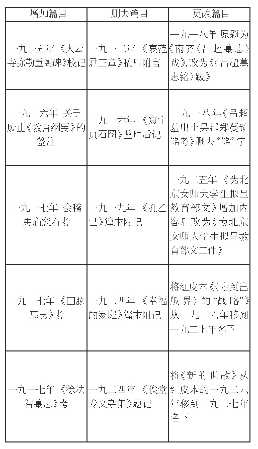 《集外集拾遺補編》篇目的變動分為三種情況——增、刪、改,數量依次遞增:增加篇目14篇,刪除篇目23篇,更改篇目42篇。更改篇目又可細分為更改標題、調整順序、調整篇目位置。更改標題25篇,如《南齊〈呂超墓志〉跋》改為《〈呂超墓志銘〉跋》,這是編注者代擬標題的情況。另一種則是恢復原有的標題。如將一九二七年的《關于“樂聞于斯”的通信》改為原名《補救世道文件四種》。調整順序6篇,根據發表時間重新排列篇目順序,如將《〈走到出版界〉的“戰略”》《新的世故》從一九二六年移到一九二七年名下。