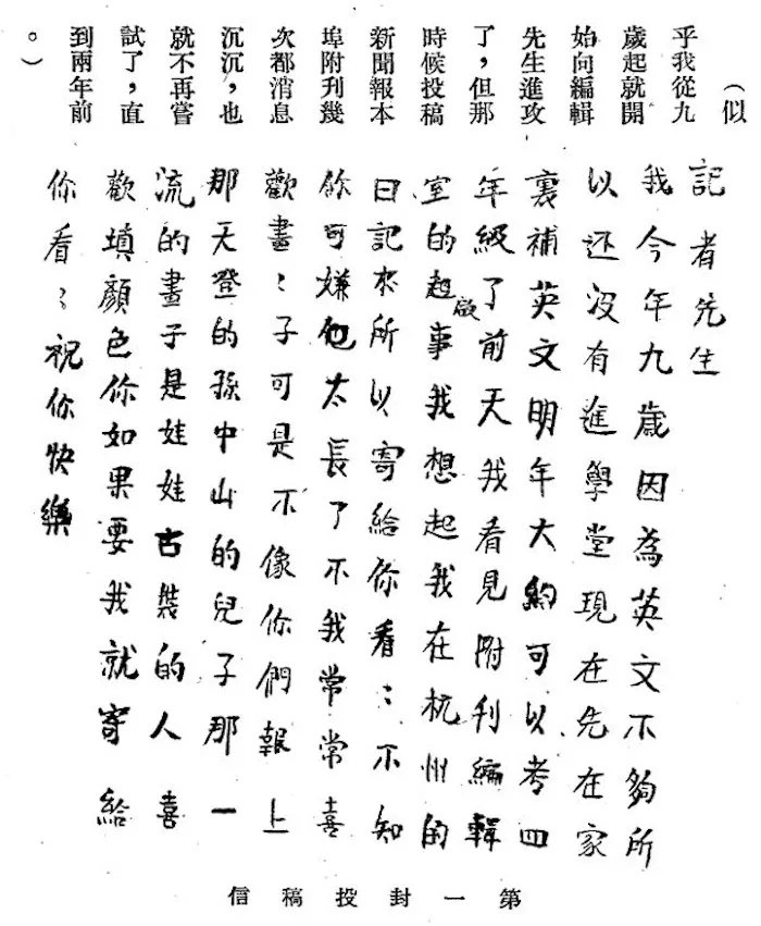 記者先生:我今年九歲,因為英文不夠,所以還沒有進學堂,現在先在家里補英文,明年大約可以考四年級了。前天我看見“附刊”編輯室的啟事,我想起我在杭州的日記來,所以寄給你看看,不知你可嫌太長了不?我常常喜歡畫畫子,可是不像你們報上那天登的《孫中山的兒子》那一流的畫子,是娃娃,古裝的人,喜歡填顏色。你如果要,我就寄給你看看。祝你快樂。