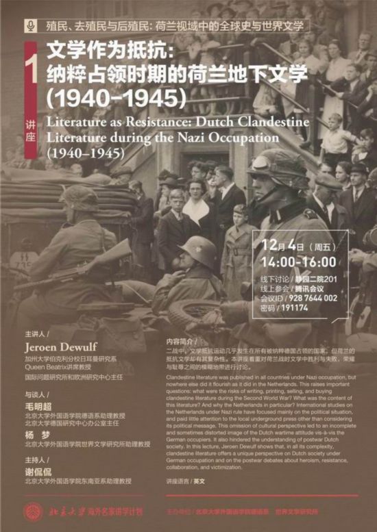 2020年12月4日,北京大學外國語學院在國際合作部“海外名家講學計劃”的支持下舉辦線上講座,主題為“文學作為抵抗:納粹占領時期的荷蘭地下文學(1940-1945)”。主講人杰羅恩·德伍夫(Jeroen Dewulf)是加州大學伯克利分校日耳曼研究系講席教授,兼任伯克利國際問題研究所和歐洲研究中心主任,主要研究方向為荷蘭殖民與后殖民文學及歷史,跨大西洋的奴隸貿易,低地國家文化,日耳曼文學及歐洲政治等。本次講座主要基于德伍夫教授專著《反抗之精神:納粹占領時期的荷蘭地下文學》(Spirit of Resistance: Dutch Clandestine Literature during the Nazi Occupation)。該研究以納粹占領時期的荷蘭地下文學為研究對象,對與其相關的歷史背景、出現原因、發展經過、主要內容以及其戰后影響等問題進行了探討。