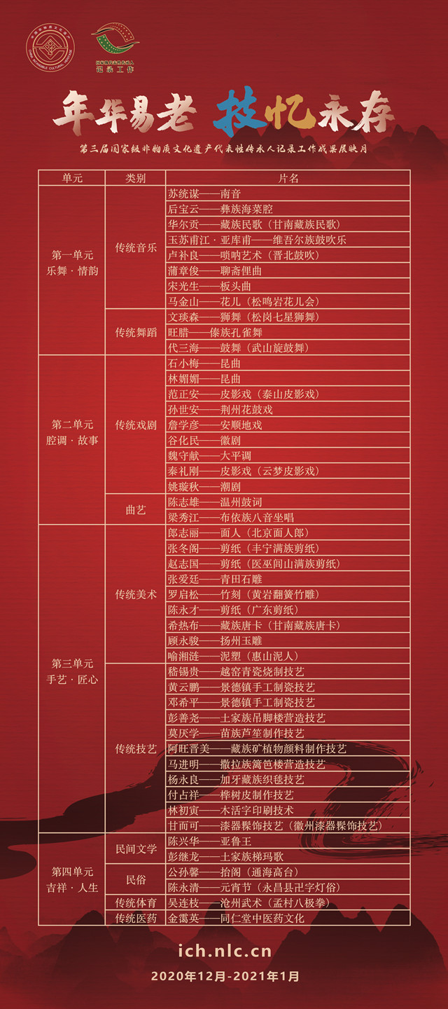 12月31日,隨著48部非遺紀錄片在國家圖書館中國記憶項目中心的非遺展映專區(ich.nlc.cn)上線,第三屆“年華易老,技?憶永存——國家級非物質文化遺產代表性傳承人記錄工作成果展映月”正式拉開帷幕。