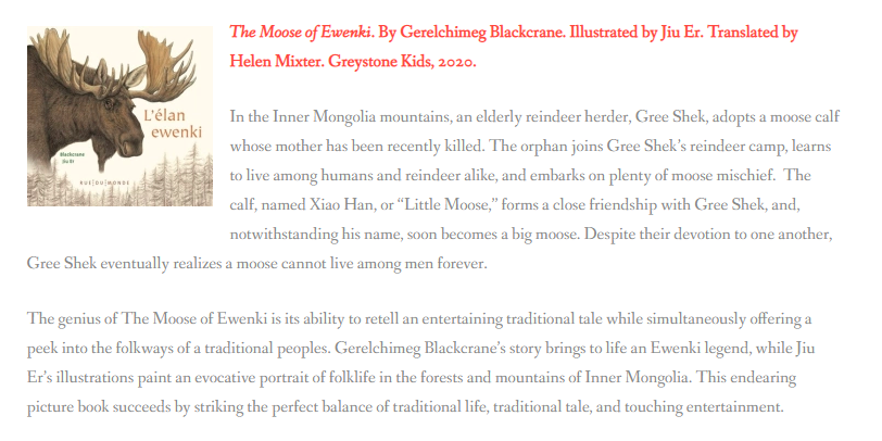據悉,《鄂溫克的駝鹿》中文簡體版于2018年5月由接力出版社出版,至今版權已售至法國、加拿大、德國、韓國、瑞典等多個國家以及中國臺灣地區。本次榮獲“伊索榮譽獎”稱號的《鄂溫克的駝鹿》即是由加拿大灰石童書出版社(Greystone Kids)引進出版的英文版The Moose of Ewenki。這也是美國伊索獎頒發以來,第二部由華人創作的作品獲此殊榮。此前,美國西肯塔基大學圖書館教授袁海旺(音譯)創作的《孔雀公主:中國少數民族的故事》獲得2009年度伊索榮譽獎。