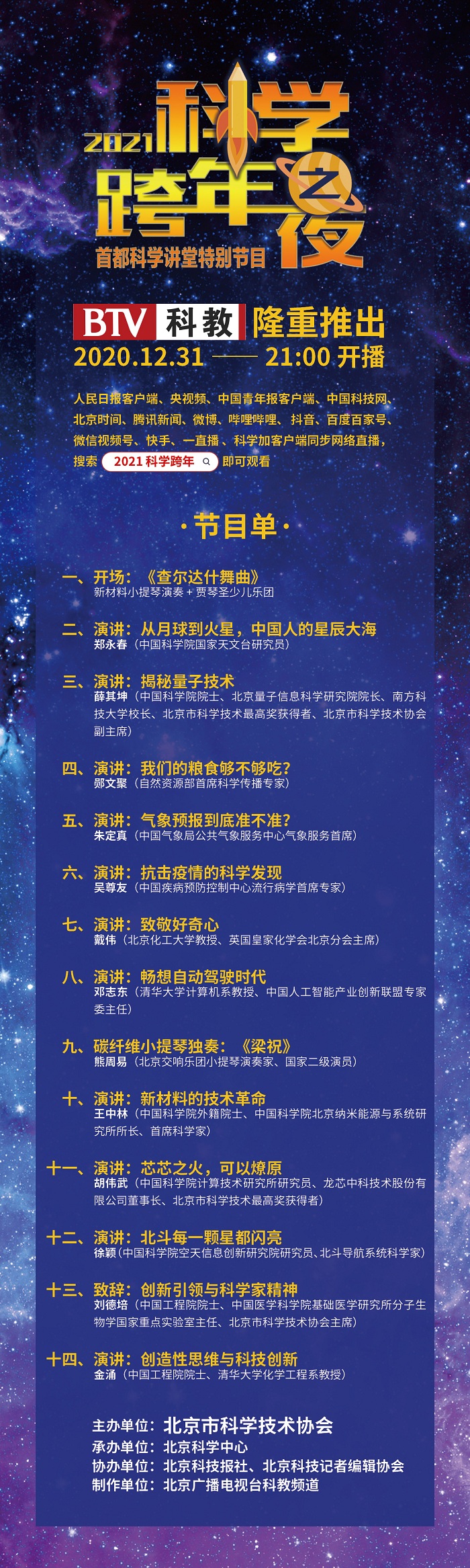 2020年12月31日晚,由北京市科學技術協會主辦,北京科學中心承辦,北京科技報社和北京科技記者編輯協會協辦,北京廣播電視臺科教頻道制作的首都科學講堂特別節目——“2021科學跨年之夜”在北京廣播電視臺科教頻道播出??缒暌够顒踊仡櫼荒曛卮罂萍际录?,展望未來創新發展趨勢,這是我國內首次以電視科學演講方式,邀請重要領域科學家接力演講陪公眾迎新年的知識跨年活動。北京市科學技術協會主席、中國工程院院士、中國醫學科學院基礎醫學研究所分子生物學國家重點實驗室主任劉德培在節目中作新年致辭。