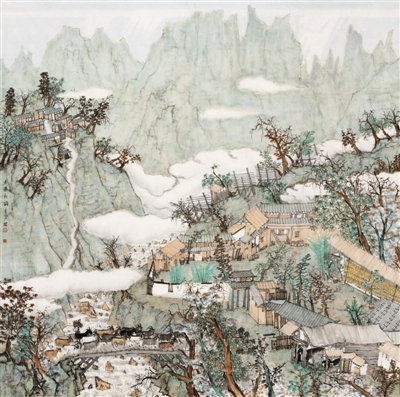 “美麗的事業·中國國家畫院扶貧主題美術作品展”上展出的何加林中國畫《老寨新韻》。