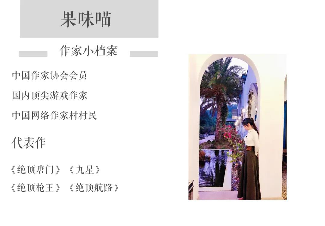 果味喵的作品《絕頂唐門》獲得兩百余萬人五星好評,完本滿意度起點全站前十;《九星》起點新書月票第一,多次沖入繁體銷量排行前十;《絕頂槍王》上架兩小時掌閱全站月票榜第一,首發網站點擊過千萬,合作方單章訂閱過十萬,改編游戲月流水過三千萬人民幣。她也是獲掌閱首屆最佳作品獎、咪咕鶴鳴杯年度作品等,入選第三屆橙瓜百強大神、網絡文學二十周年人物盤點游戲分類十位代表作家。