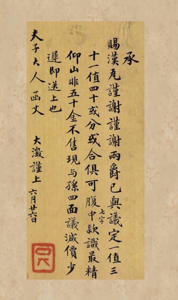 承賜漢瓦,謹謝謹謝。兩爵已與議定,一值三十,一值四十,或分或合俱可。腹中七字款識最精。 仰山非五十金不售,現與孫四面議減價,少遲即送上也。 夫子大人函丈。大澂謹上。六月廿六日