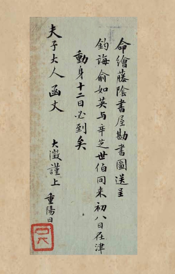 命繪《藤陰書屋勘書圖》送呈鈞誨。俞如英與辛芝世伯同來,初八日在津動身,十二日必到矣。 夫子大人函丈。大澂謹上。重陽日。