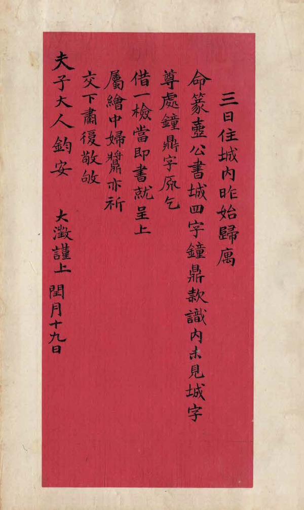 三日住城內,昨始歸寓, 命篆“壺公書城”四字,鐘鼎款識內未見城字, 尊處《鐘鼎字原》乞借一檢,當即書就呈上。屬繪中婦?亦祈交下。肅復,敬敂 夫子大人鈞安。大澂謹上。閏月十九日