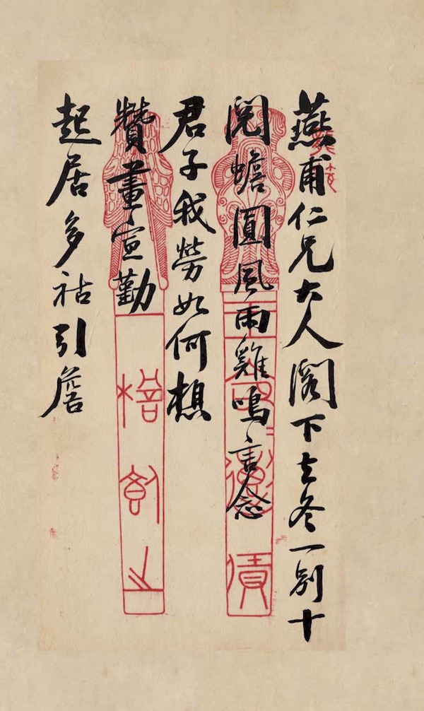 燕甫仁兄大人閣下:去冬一別十閱蟾圓,風雨雞鳴,言念君子,我勞如何,想贊畫宣勤, 起居多祜,引詹