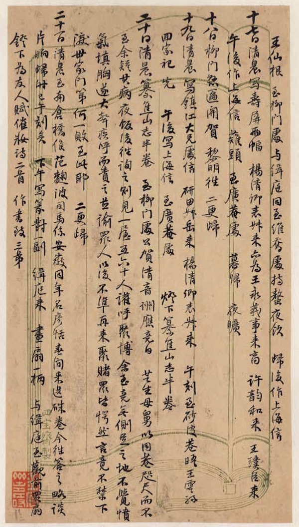 十九日 清晨寫鎮江大兄處信。研田叔岳來,楊清卿表叔來。午刻至砂皮巷晤王云孫, 回家祀先。午后寫上海信,至廣菴處。燈下纂《焦山志》半卷。