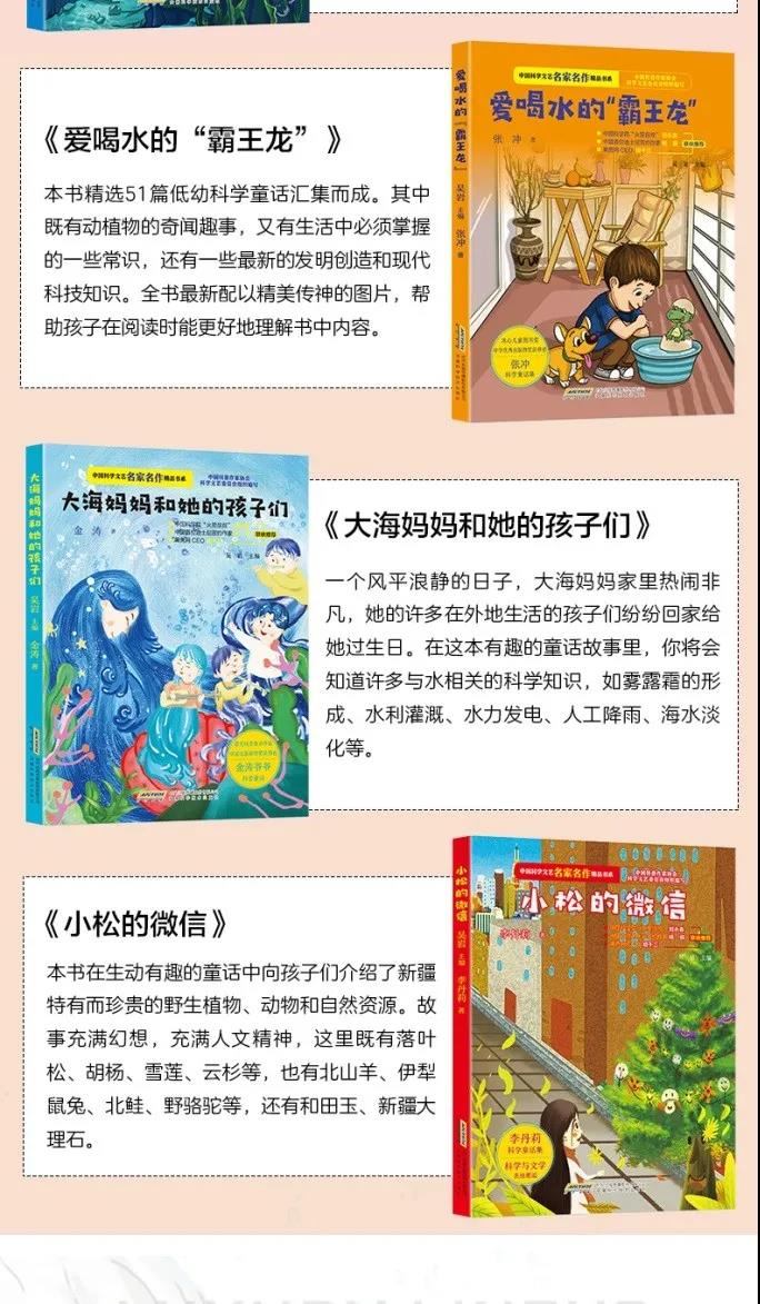 安徽科學技術出版社出版由吳巖主編的《中國科學文藝名家名作精選書系》,其中包括科學童話專集6冊 ,分別是李毓佩的《數學司令》、劉興詩的《飄浮在空中的城市》、凌晨的《跳跳和它的朋友們》、金濤的《大海媽媽和她的孩子們》、李丹莉的《小松的微信》和張沖的《愛喝水的“霸王龍”》。
