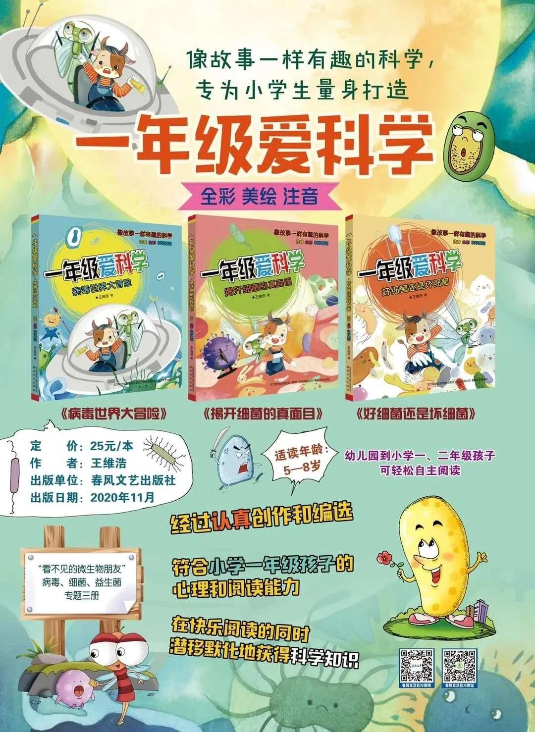 春風文藝出版社出版王維浩編繪的《好細菌還是壞細菌》《揭開細菌的真面目》和《病毒世界大冒險》(《一年級愛科學》系列)。這套關于病毒、細菌和益生菌的科學童話,是王維浩在新冠病毒疫情期間接到出版社約稿后,花了整整一個月時間創作的。