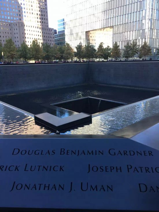 緩緩流淌的水,是那些曾經鮮活的生命。紀念噴泉池那莊重的黑色大理石和深入地下的池底,是凝重的祭奠,讓那天逝去的人們在死亡中得享尊嚴。