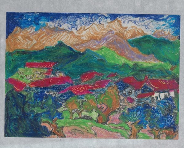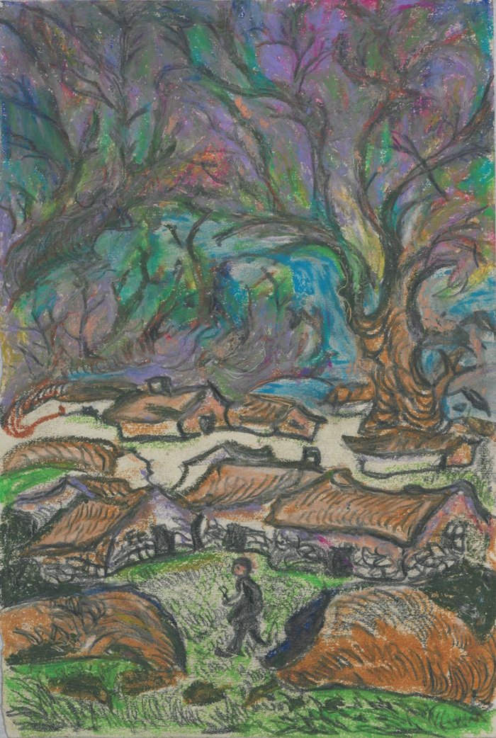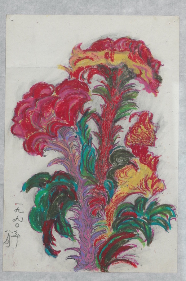 展廳的最后一部分呈現的是劉峴的藝術創作。包明吉表示,“這些作品大多是劉峴晚年因身體狀態導致無法手握刻刀后而改用油畫棒等其他手段所創作的作品,包括晚年為《野草》再做的插圖等?!?/p>