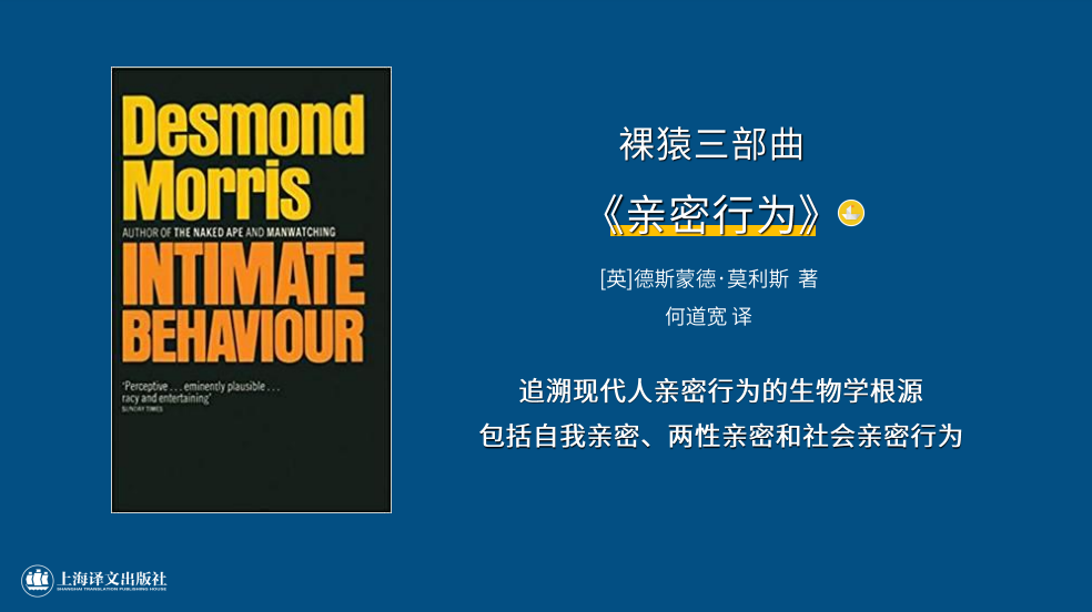 今年全新亮相的社科新書系“譯文科學”將推出英國著名動物學家、生物人類學家德斯蒙德·莫利斯暢銷全球2000余萬冊的經典之作“裸猿三部曲”。莫利斯以嚴謹的科學態度和貫穿一生的觀察研究,通過《裸猿》《人類動物園》《親密行為》三部作品向人類宣稱:人,不是從天而降的天使,而是由地而生的猿猴。