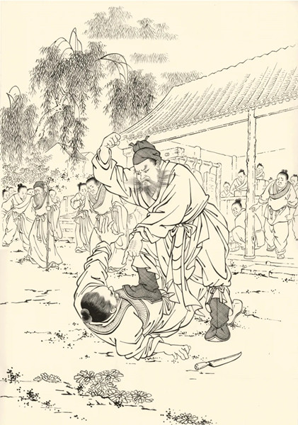 且說鄭屠開著兩間門面,兩副肉案,懸掛著三五片豬肉。鄭屠正在門前柜身內坐定,看那十來個刀手賣肉。魯達走到門前,叫聲:“鄭屠!”鄭屠看時,見是魯提轄,慌忙出柜身來唱喏道:“提轄恕罪!”便叫副手掇條凳子來,“提轄請坐!”魯達坐下道:“奉著經略相公鈞旨:要十斤精肉,切做臊子,不要見半點肥的在上面?!编嵧赖溃骸笆沟?!—你們快選好的切十斤去?!濒斕彷牭溃骸安灰堑入缗H廝們動手,你自與我切?!编嵧赖溃骸罢f得是,小人自切便了?!弊匀ト獍干蠏耸锞?,細細切做臊子。
