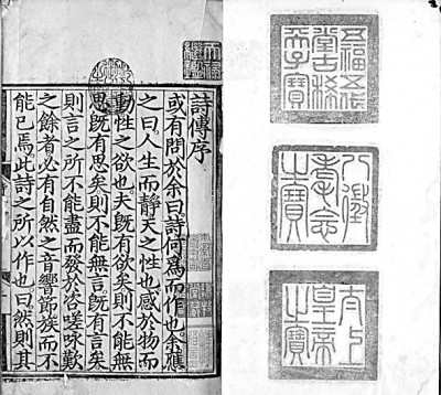 另有一個最主要的特征,它的鈐印也是整齊劃一的。即使書改裝了,里面的鈐印還可能保存下來?!肚熬帯贩怖唬骸爸T書每冊前后皆鈐用御璽二:曰‘乾隆御覽之寶,曰‘天祿琳瑯’?!倍仪熬帟m然盡毀,但還有“目外書”以做實物參考。另有一直接例證,即清乾隆四十八年武英殿刻本《御定仿宋相臺岳氏本五經》之《春秋經傳集解》。乾隆皇帝很喜歡“岳氏五經”,想單獨存放。但只找到了四部,少一部《春秋經傳集解》,后在“天祿琳瑯”前編中找到并一起放置到昭仁殿后廡的“五經萃室”。之后武英殿翻刻這五部書,用影刻方式覆刻了“岳氏五經”,板式和書上印記都被原樣摹刻下來,忠實再現了“天祿琳瑯”前編書的原貌。