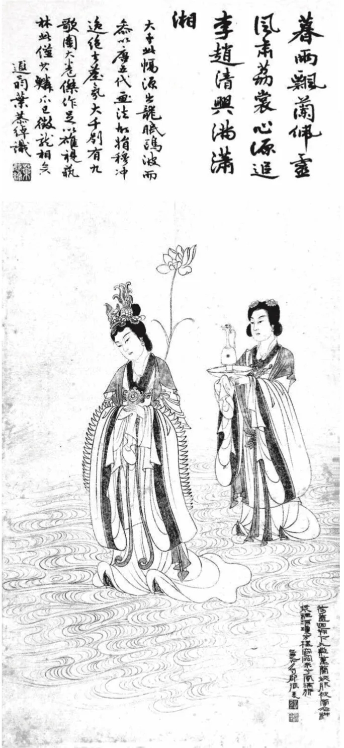 《湘夫人圖》明顯地表現出渾融貫通的色彩,既不像趙孟頫那樣純粹的清雅明暢,也不像陳洪綬那樣的詼詭清異,其能博采唐宋的雅麗而濟以敦煌的雄健,表現出中國人物畫的至高境界。就其人物形象來看,此畫湘君、湘夫人皆為女神,這與前述傅抱石一樣,取二人為舜帝二妃娥皇、女英之意。畫中湘君在前,風姿挺拔,頭部微側,眉目從容恬靜,一股超然出塵之氣,手捧的荷花亦是昂然卓立,是其卓異獨立氣質的象征;對湘夫人的描繪合于其妾的身份,其身形小于湘君,手執凈盤,正視前方,肅然卓立。二人腳下為一江之水,兩人高潔飄然的形象呼之欲出,頗有敦煌壁畫人物的神韻,而絕無清代仕女圖中病態懶散的氣息。從技法上看,此圖取法高古,其人物衣飾的描畫,簡捷疏朗,“以設法變其白描”,“行筆巧密”而“古澹明潔”,這正是張大千長期學習李公麟、趙孟頫的成果。其細部的勾勒筆法工謹而簡淡,而整幅畫的風格卻氣脈貫通,軒然超絕,顯然是注入了敦煌人物畫的大氣靈動之態。要言之,張大千的《九歌圖》融會不同時期人物畫的優長,為我所用,成就了傳統繪畫技藝在新時代的一條突圍之路,從而彰顯出傳統繪畫在中西文化劇烈沖突時代的強大生命力。