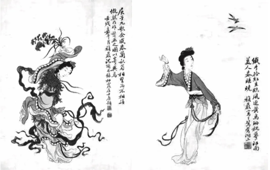 沈燧《屈子九歌圖》筆法疏朗,畫面中的女子身姿輕盈,側首凝望,羅帶飄飄,袍袖飛舞。其身披春蘭,而手執秋菊,春蘭、秋菊色彩灼灼。兩種在實際生活中分屬不同節令的花卉,在畫家的藝術世界里交相斗艷,而不感突兀。沈燧的這種藝術構思與王維的《雪中芭蕉圖》有異曲同工之妙,而在《九歌圖》的繪制歷史中卻屬于首創。這與近代以來的社會文化變革有著密切的關系?!冻o》研究漸漸擺脫忠君抒憤的套路,傳統的經典得到了更為多元化的解讀,人們開始更加重視其中蘊藏的審美意趣與純文學的魅力,這就為根據《九歌》題材放手開展藝術加工提供了新的啟示與可能。而畫家身份的巨大變遷,也為《九歌圖》的新變奠定了基礎。宋元明清時代《九歌圖》的作者或為文人學士如趙孟頫等,或為草遺民志士如蕭云從等,他們的畫風昭示著濃厚的雅文化意味。而自近代以來,像海上畫派這類彰顯世俗化、民間化創作傾向的畫派開始登上畫壇,在畫家的身份定位上,有一種文人色彩漸退而市民色彩加濃的趨向。沈燧就屬于這一類畫家,其長期以賣畫為生,在題材的選取、筆法的展示、風格的鑄煉等方面都盡可能地去貼近大眾品位?!肚泳鸥鑸D》也正是以市民大眾的視角重新闡釋《九歌》而形成的佳作。