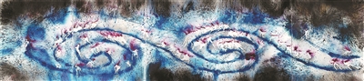 沒想到走入午門正樓展廳,展覽第二部分即是《歸來》?;貧w中國文化與精神,回到養育他的大地與母體,展廳中展出了麻紙、絲綢等不同媒材的火藥繪畫,傳遞出中華文化的磅礴氣勢。最壯觀的莫過于巨幅作品《柏風》,以黃帝陵的柏樹為靈感,作品由長短不一的導火線和粗細搭配的火藥爆破一氣呵成,象征長生、堅韌不屈,懸掛在空中的數只瓷鳥也經火藥爆破而成,亦是象征生命力頑強吧!