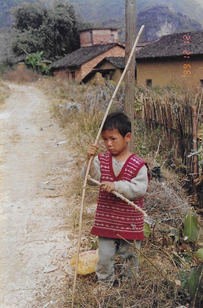 “那里和我的家鄉差不多,都是用泥磚砌的房子,我癡癡地看著那些房子、那些山,仿佛回到了家鄉?!本驮陉愒姼鐝囊粋€山村邊經過的時候,看到路邊站著一個五六歲的小男孩,右手拿著一根長長的竹竿,左手拿著一根短短的木棍,他眉頭微蹙,側著腦袋看著這群不速之客。
