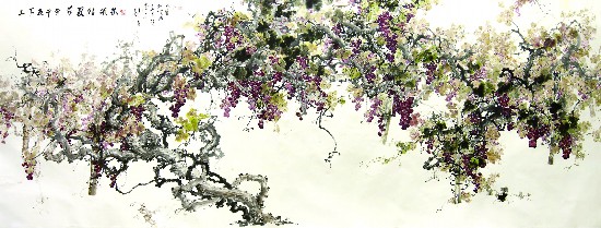 “連枝盈紫氣,滿架發清香。疑自瑤池下,人間獻瑞祥?!边@是我在欣賞盧一心先生以葡萄為題材創作的諸多作品時乘興所撰的一首短詩。