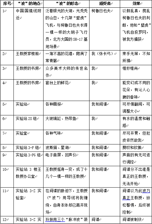 如上表所示,“波”貫穿于小說的始終,是故事情節發生、發展到高潮的主要推手和真正主角。這是何等超前和瑰麗的科幻想象:楓市王教授設計出來的用于軍事防御的波-45系統,以波的原理營造出變化萬端的虛擬場景,使北方大國的壁虎式飛機自投羅網;“我”去王教授家,被其住宅外的花墻波、住宅內的中外名作畫像波、窗臺上不斷變換著的鮮花波深深吸引,嘆為觀止;面對敵人的控制,王教授利用波形成迷幻陷阱,巧擒企圖竊取波理論專利的亡命之徒……在小說中出現的幾場“貓捉老鼠”的游戲中,起先貌似是入侵者(不管是駕駛壁虎式飛機的柯魯日也夫,還是假冒“洪青”竊取波理論的亡命之徒)掌握主動權,但隨著故事的逐漸推移,他們紛紛敗在了“波”的面前。這是人類科技智慧的較量與比拼,“波”的千變萬化,與各種所需場景進行視覺、聽覺、味覺、嗅覺等方面的無縫融合與對接。