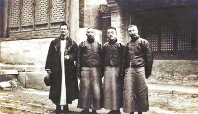 1920年3月,蔣夢麟、蔡元培、胡適、李大釗(左起)合影于北京西山臥佛寺