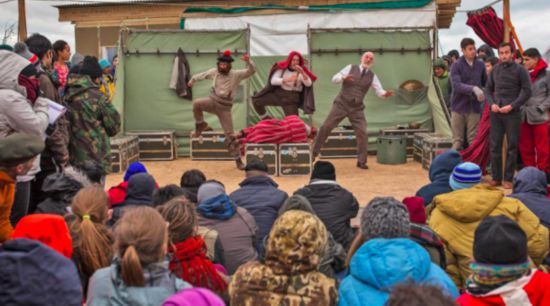 我和設計師喬納森·范森決定在服裝上借鑒20世紀30年代的左翼巡演劇團風格,比如瓊·利特爾伍德和尤安·麥科爾的“行動劇場”。披上幾件斗篷,戴上幾頂帽子,在戲服的剪裁和樣式上能與伊麗莎白時期的服裝有幾分神似。在之前的兩次巡演中,我們與勞拉·福里斯特-海和比爾·巴克利這兩位作曲家合作,將一系列歌曲和配樂組合打造成了獨具風格的演出配樂。溫暖的民謠歌曲能緩和氛圍,也消除了觀眾們對莎士比亞和哈姆雷特這兩個名字的敬畏。為了讓多才多藝的演員、歌唱家都能大展拳腳,我們在配樂上加入了更多的音樂元素:響亮的喇叭吹奏、鬼魂現身時營造氛圍的刮擦聲、用于場景過渡的尖利小提琴聲、伴隨奧菲利婭出場的柔和管風琴旋律,還有渲染緊張氣氛的鼓點。這些配樂全都是現場演奏,且都在眾目睽睽之下完成。環球劇院的舞臺上沒有秘密:秀就要秀出全部。