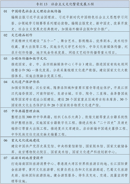 實施文化產業數字化戰略,加快發展新型文化企業、文化業態、文化消費模式,壯大數字創意、網絡視聽、數字出版、數字娛樂、線上演播等產業。加快提升超高清電視節目制播能力,推進電視頻道高清化改造,推進沉浸式視頻、云轉播等應用。實施文化品牌戰略,打造一批有影響力、代表性的文化品牌。培育骨干文化企業,規范發展文化產業園區,推動區域文化產業帶建設。積極發展對外文化貿易,開拓海外文化市場,鼓勵優秀傳統文化產品和影視劇、游戲等數字文化產品“走出去”,加強國家文化出口基地建設。
