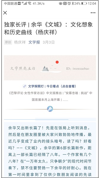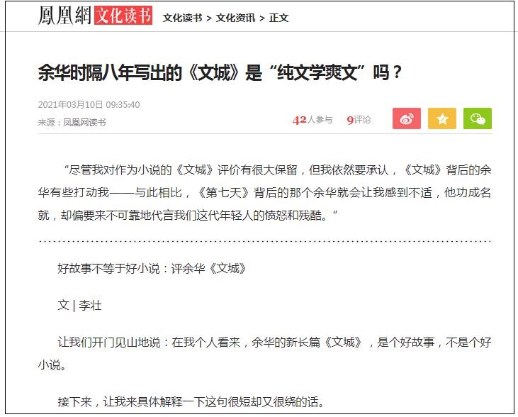 3月10日,鳳凰網-文化頻道發布青年批評家李壯文章《好故事不等于好小說:評余華〈文城〉》。