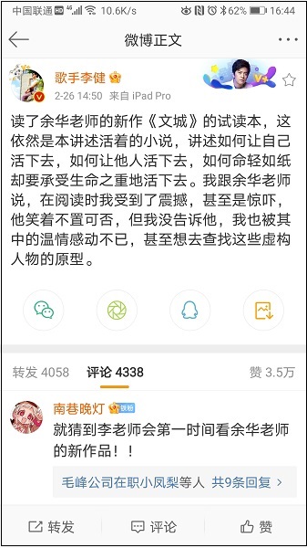 2月26日下午,李健發微博談論《文城》。截至3月22日,該條微博已獲3.5萬贊,轉發、評論各4000余次。