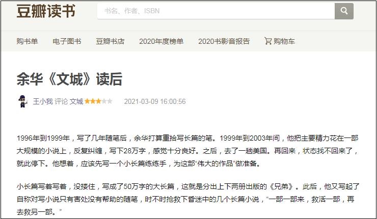 在《文城》不斷熱賣熱評引發文學界內外討論的同時,一條“余華獻計助力高考作文”的新聞引人矚目。3月9日下午,國內某知名教育培訓機構舉辦了一場“中高考沖刺——四大專家獻計2021中高考的高端輔導家長會”直播活動,余華、劉擎、樊登等在活動中發言。被網友指摘的是,余華全程念稿、僵硬死板,強調“句子積木”,破壞了創作活性。當然也有支持者:有的家長反對上述看法,認為套路化的應試寫作的確與文學創作是兩回事,且余華講授中并沒有刻意降低寫作品味來謀取高分,孩子聽過余華、劉擎等人的發言后會去自覺查找他們的書籍著述,提高自己的洞察力與理解力。之所以要在一篇關于《文城》評論的綜述末尾牽扯一則時事熱點,是因為受眾對這條新聞的態度與對《文城》的評論著實有太多不謀而合之處。應該用什么樣的方式進行文本敘述?作家是否有必要不斷進行自我突破?什么樣的姿態就是文學對資本的妥協?倘若真的有新思路與新方法,它在理解的過程中又會發生哪些變異?諸如上述問題,還將延續在對《文城》以及對更多當代文學作品的討論之中。最后,我想用三條評論作為本文的結尾,并希望在未來的時間里有關《文城》的討論、解讀與闡釋能良性地繼續下去——