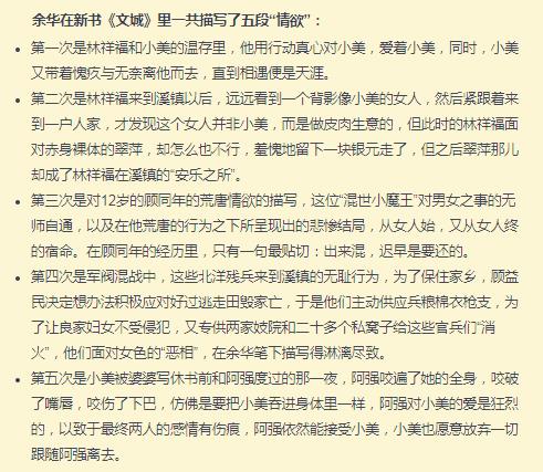 網易號“六秒”對《文城》細讀后,將小說中五次情欲描寫逐一列舉出來。