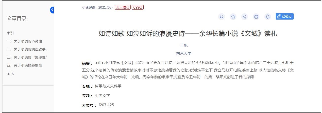 丁帆《如詩如歌 如泣如訴的浪漫史詩——余華長篇小說<文城>讀札》,發表于《小說評論》2021年第2期。