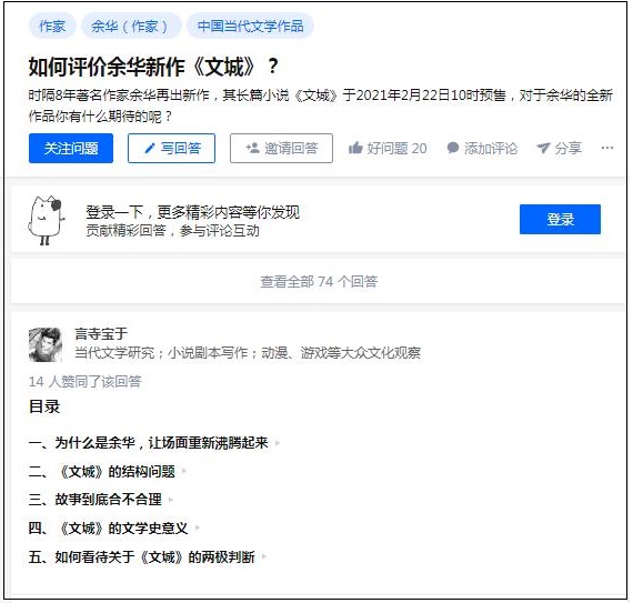 在知乎“如何評價余華新作《文城》”的問答中,已有74條長回答。圖為知乎用戶“言寺寶于”的回答?!把运聦氂凇睆摹段某恰返慕Y構、故事、文學史意義等角度出發,并著意于作品出版后的“兩極判斷”,表達了自己的觀點。