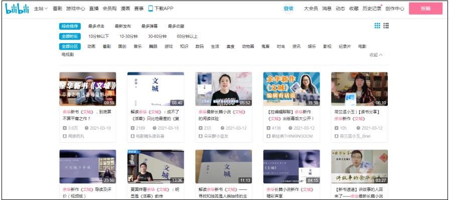 值得關注的當然還有很多來自普通讀者的聲音,在微博、知乎、抖音、B站上,年輕受眾對這部余華新作也保持著極高的熱情,不僅有自媒體接連發布作品分享讀后感,還有圖書營銷號制作了“《文城》金句摘抄”視頻合集。網友們的回復也很精彩,有人說“好像所有主角的名字都帶‘?!帧?,有人說“《文城》明顯是《活著》的前傳”。3月11日,“一點資訊”APP推出文化熱點專題,對《文城》進行整體介紹,匯聚了部分關于作品的正面、反面觀點,并允許用戶自由發布評論及讀后感言。3月12日,新經典公司在B站上傳了“拉編輯聊聊”視頻“余華新作《文城》出版幕后大公開”,《文城》責編白雪出鏡和大家講小說編輯背后的故事,在視頻中白雪對書名、封面、印數、小說特點等方面都做了簡明扼要且適應B站內容輸出風格的介紹。