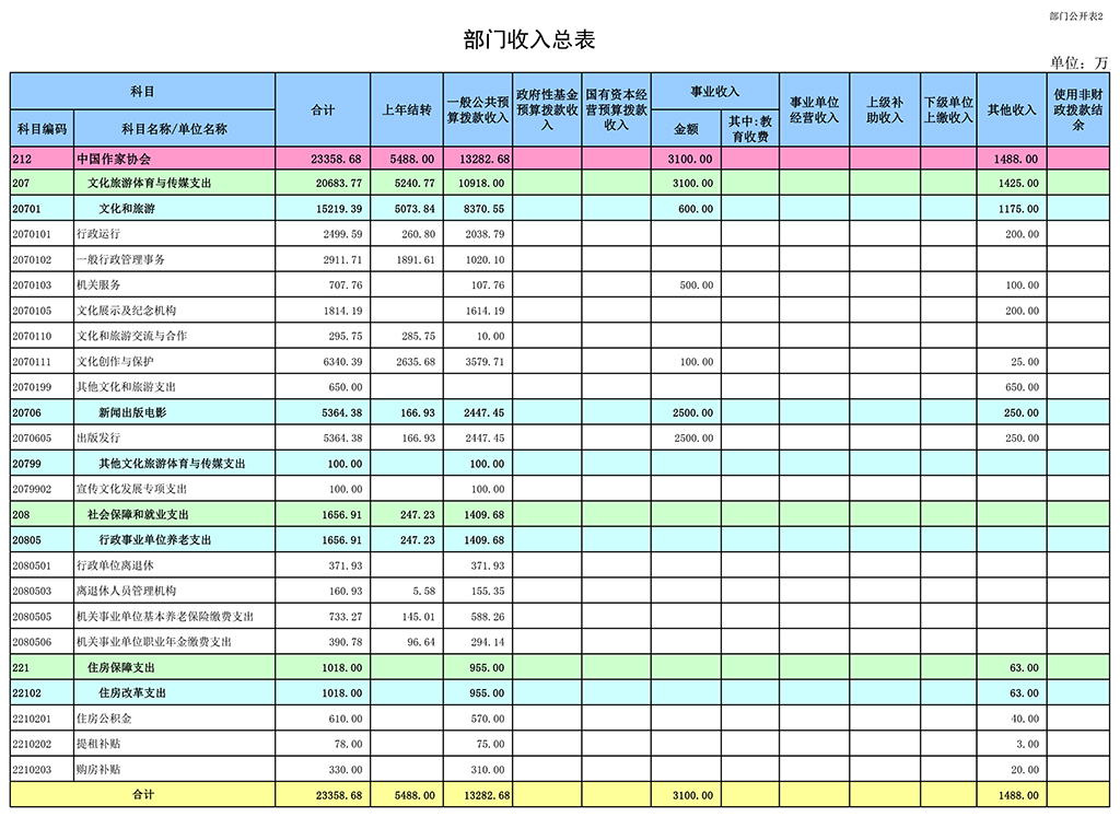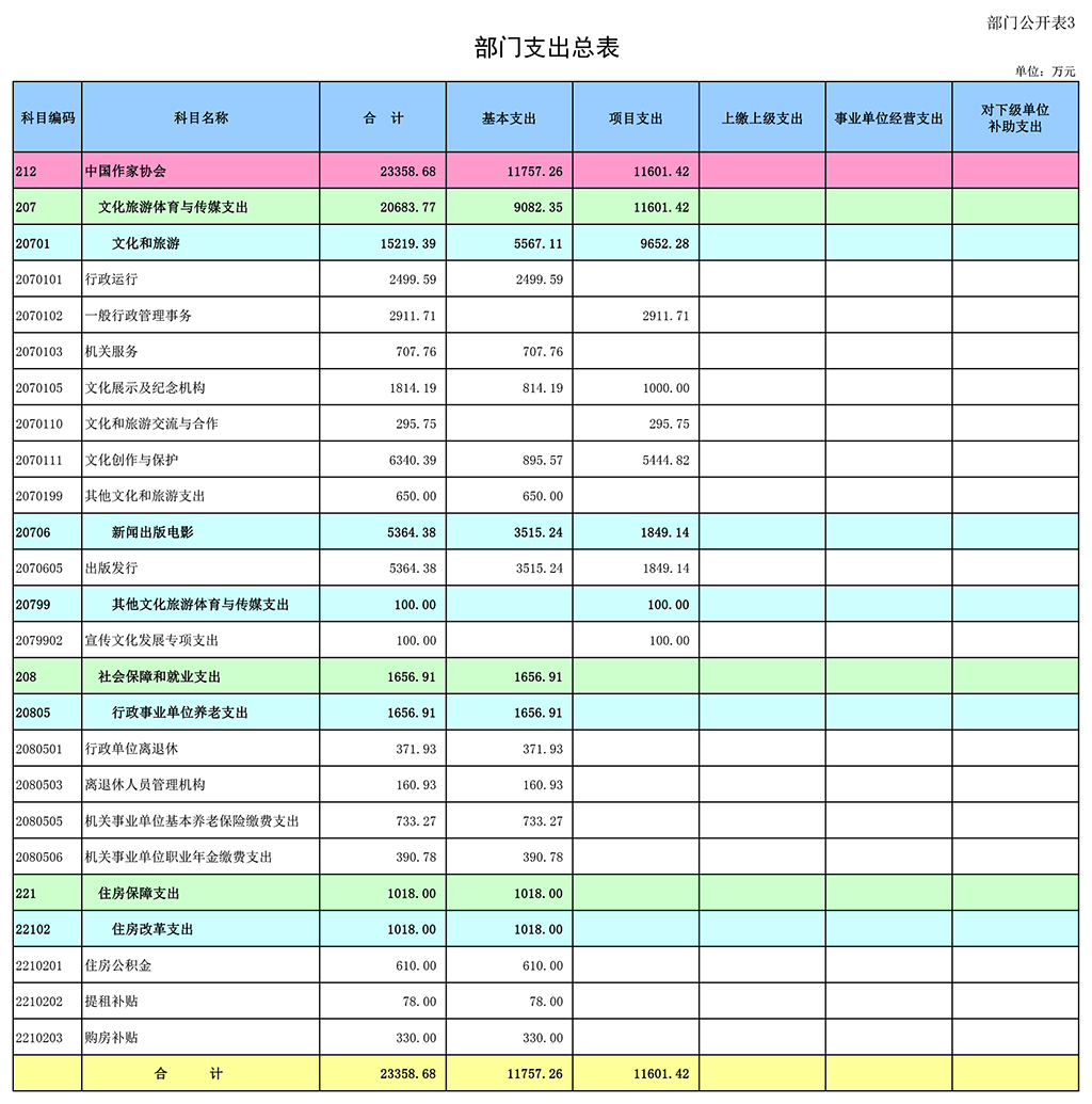 (十二)文化旅游體育與傳媒支出(類)新聞出版電影(款)出版發行(項):主要指中國作協所屬報刊社網出版傳播的項目支出。