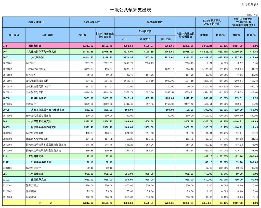 五、關于中國作家協會2021年一般公共預算支出表的說明