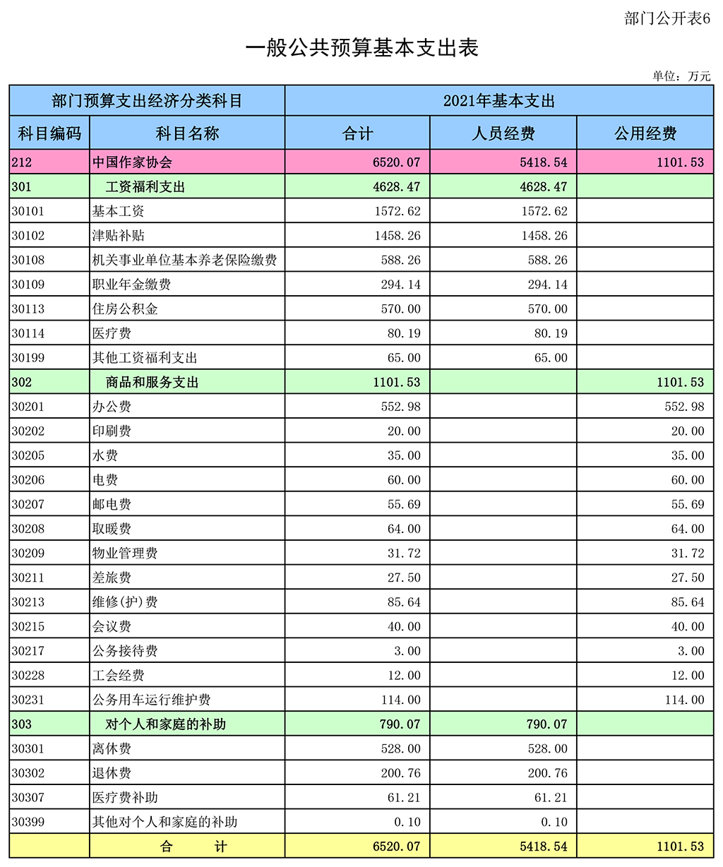 中國作家協會2021年一般公共預算基本支出6520.07萬元,其中: