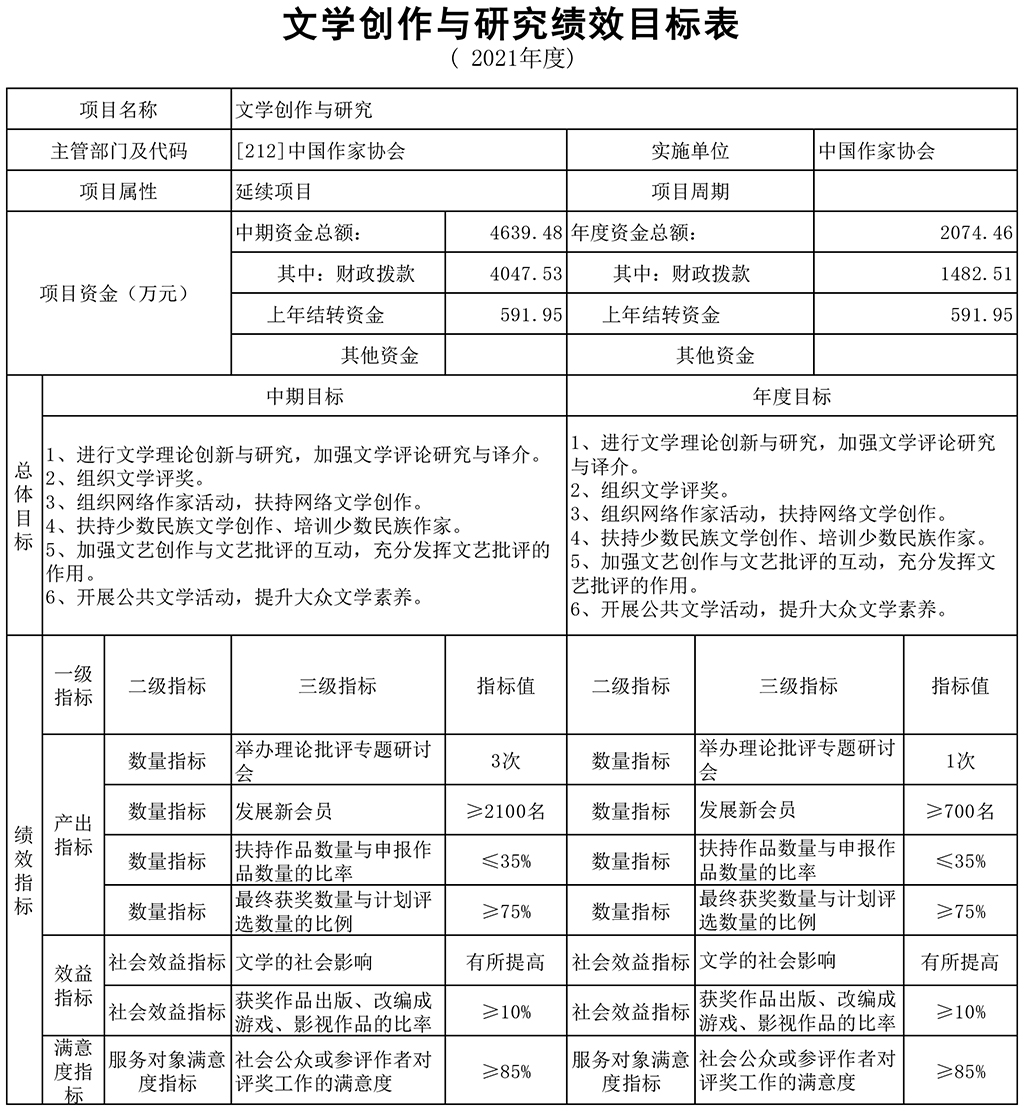 2021年對我會項目支出全面實施績效目標管理,涉及預算撥款6762.61萬元,一級項目8個,二級項目21個。同時,擬對“文學出版與傳播”和“組織文學評獎活動經費”2個項目開展部門評價,涉及財政撥款2250萬元。根據以前年度績效評價結果,優化文學創作研究譯介經費、作家創作與聯絡經費等項目支出2021年預算安排,并進一步改進管理、完善政策。