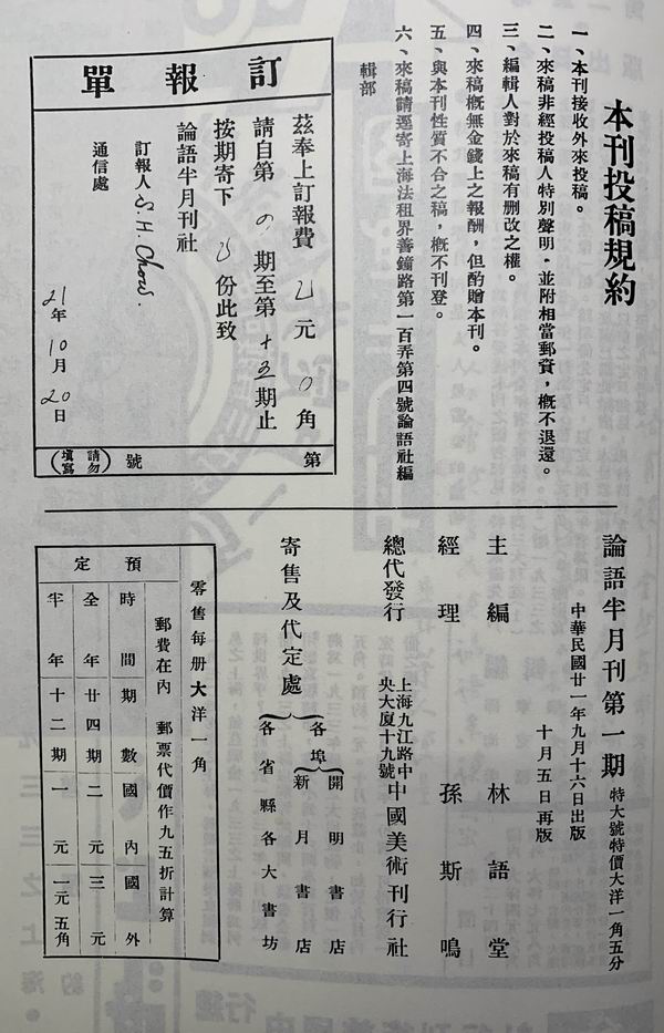 《論語》創刊號版權頁,上海書店影印