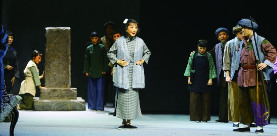 “詩化”是傳統戲曲的基本特點,而戲劇語言卻需“貴顯淺”,本劇語言便努力在詩化、口語化、性格化上實現統一?!霸娀笔菨B透在戲曲舞臺藝術的全過程中的,包括戲曲文本、舞臺美術、音樂設計到表演形態等各方面。從戲曲文本來看,該劇文本在充分尊重史實的基礎上,經過認真的選擇、集中和典型化的藝術處理,努力將歷史真實、生活真實和藝術真實統一起來。劇本的文學性很強,詩化表達隨處可見,唱腔念白朗朗上口,令人回味無窮。該劇劇本精于煉字,講究文字的錘煉,排比修辭手法的運用讓人印象深刻,以酣暢淋漓之情和摧枯拉朽之勢,渲染烘托生動傳神之美。以“問”“我問你”等開頭的排比步步緊逼、一氣貫通,讓人無可辯駁,抒發了強烈的情感表達,三個“沒見到”“怎讓你”、四個“一”“再莫說”“也曾經”、六個“他想讓”等,層層遞進、鞭辟入里,生動細致地刻畫出人物豐富細膩的內心世界,處處顯示出語言對人物塑造、情節渲染的力量。