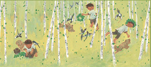給年幼兒童的繪本,也應該適度地進行挫折教育、苦難教育。令我欽佩的是,《喜鵲窩》所反映的嚴酷的沙漠生活里的艱辛、磨難,并不是被大呼小叫地喊出來的,而是不動聲色地表現出來的。之所以能不動聲色,是因為作品背后有強大的信念在支撐。沙娃一家的家園被毀后,文字故事以走向沙漠深處結束,但是,后環襯依然在敘述故事。在后環襯上,近處有繁茂的白楊樹和“海子”,遠處浮現出了綠洲。綠色,是希望的顏色。這顯然昭示了災難后的希望,表現了樂觀主義的人生觀。對于寫給年幼兒童的繪本,表現虛無和悲觀,是死亡的暗示,表現達觀和樂觀,則是對生命的鼓舞。