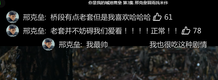 中國作家網:彈幕會說到有一些情節比較老套、生硬,比如米佧訓練時為了送一位老人回村在山里迷路,邢克壘去救她,米佧剛被批評擅自出營又出了營地,就是情節刻意為了讓這對CP遇到。這個時候,彈幕也有鳴不平的觀點,說這是十年前的文,有些情節、套路老套也很正常,甜分到位就可以了,您怎么看?