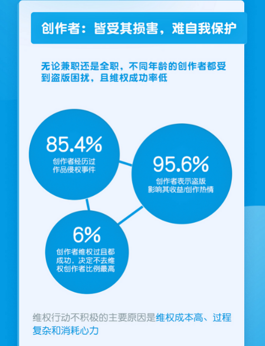 閱文集團白金作家、熱播劇《錦心似玉》原著作者吱吱表示,調查顯示,在遭遇過侵權的創作者中,僅32.1%的創作者有過維權行動。維權行動不積極的主要原因是維權成本高、過程復雜和消耗心力。